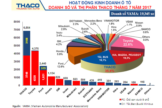 According to the report of the Vietnam Automobile Manufacturers Association (VAMA), in July 2017, VAMA sales reached 19,345 vehicles. Of which, THACO continues to lead the Vietnam automobile market with 6,854 vehicles, accounting for 35.4% of the market share.