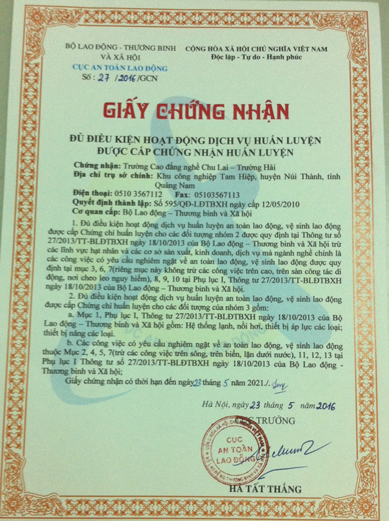 On 23 May 2016, Chief of Labor Safety Department - Ministry of Labor - Invalids and Social Affairs issued Decision No. 27/2016/GCN, to certify that Chu Lai - Truong Hai Vocational College "is qualified to implement the labor safety - hygiene training and grant the training certificates to the employees".