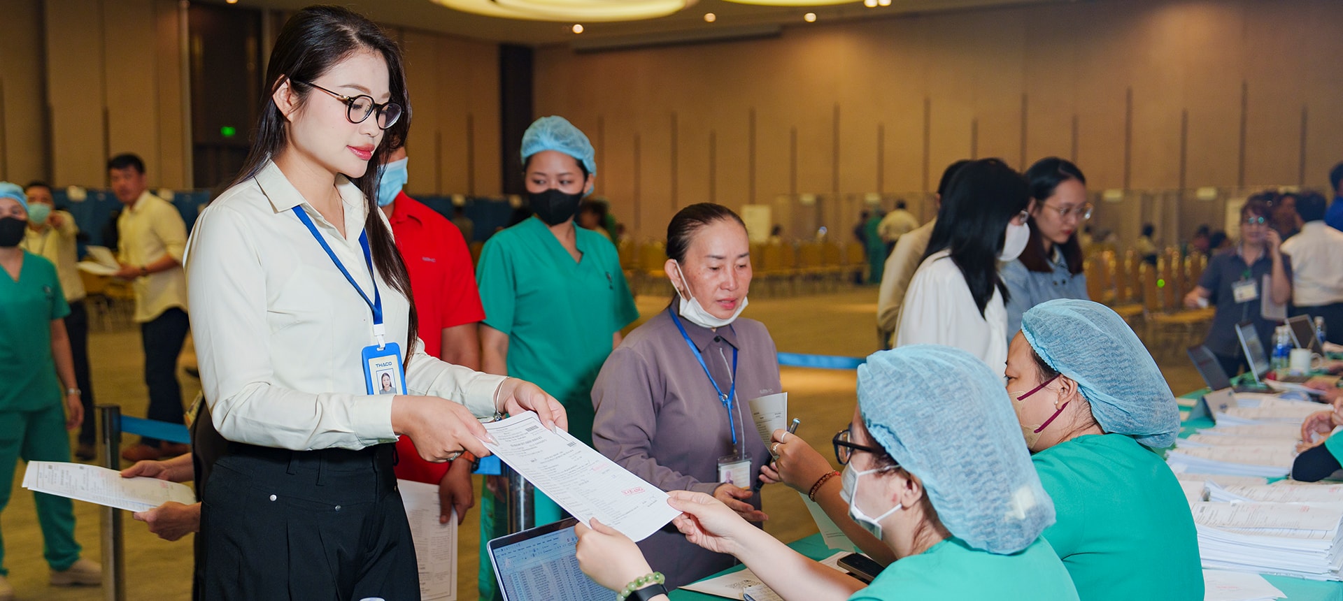Sáng giữa tuần, Hội trường Sales Gallery, TP.HCM trở nên đông hơn khi diễn ra hoạt động thăm khám sức khỏe dành cho CBNV THACO. Khác với mọi khi, thay vì tham gia buổi họp hay các khóa đào tạo, hôm nay là ngày tôi (Trần Hoài Phương, Ban Marketing THACO) xếp hàng chờ đến lượt khám sức khỏe định kỳ.