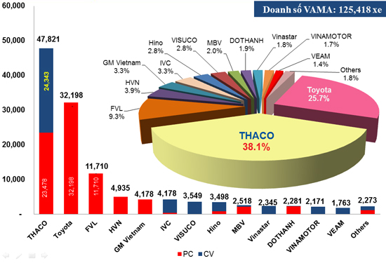 Theo Báo cáo của Hiệp hội các nhà sản xuất ôtô Việt Nam (VAMA), 8 tháng đầu năm 2015, doanh số bán ra của các thành viên VAMA đạt 125.418 xe, tăng 62% so với cùng kỳ năm 2014. Trong đó, doanh số THACO đạt 47.821 xe, với 23.478 xe du lịch và 24.343 xe thương mại, tăng 95% so với cùng kỳ, chiếm 38,1% thị phần VAMA và dẫn đầu thị trường ô tô Việt Nam.