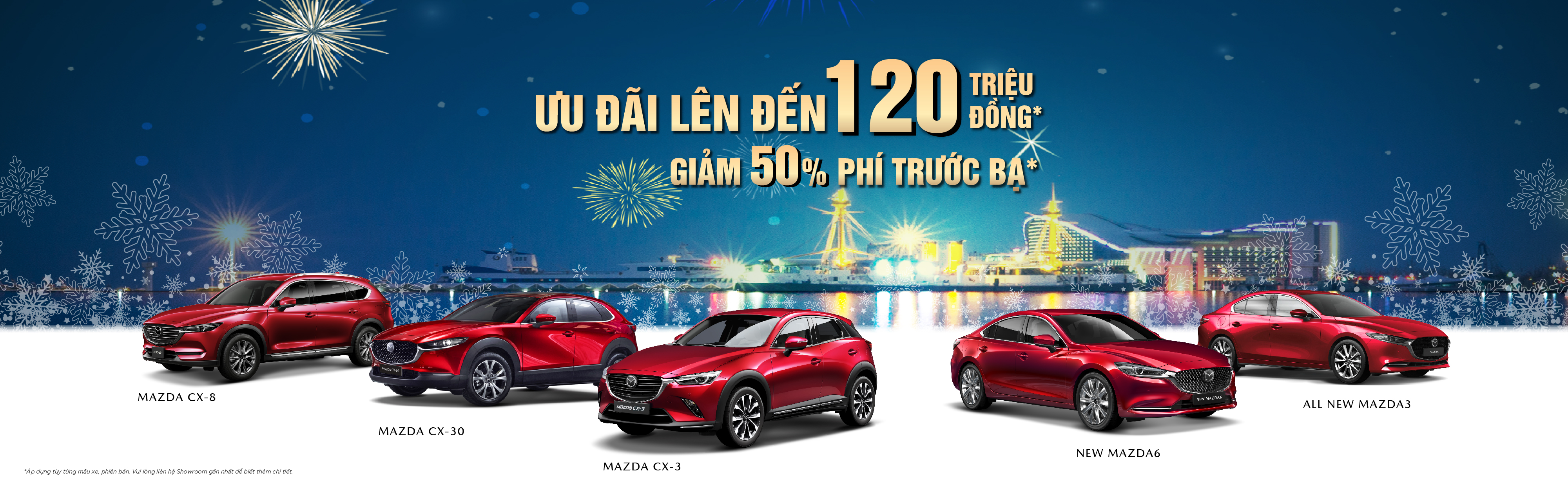Bên cạnh chính sách giảm 50% phí trước bạ dành cho xe ô tô lắp ráp trong nước, Mazda Việt Nam áp dụng ưu đãi phí trước bạ dành cho các dòng xe nhập khẩu bao gồm 50% đối với New Mazda2, Mazda CX-30 và 100% đối với All New Mazda BT-50. Ngoài ra, khách hàng sở hữu xe Mazda trong tháng 12 sẽ được ưu đãi lên đến 120 triệu đồng, cùng nhiều quà tặng giá trị (áp dụng tùy từng mẫu xe cụ thể).
