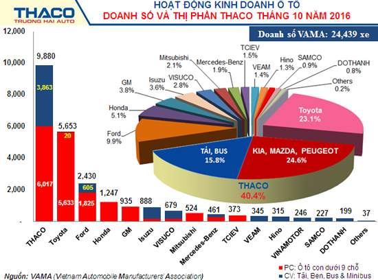 In October, THACO sold 9,880 vehicles, including 6,017 passenger cars and 3,863 commercial vehicles, increasing the total car sales in 10 months to 92,499 vehicles, 43% higher than the same period last year.