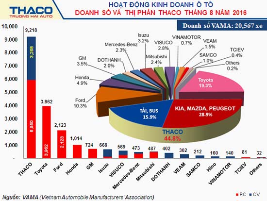 In August 2016, THACO sales tend to slightly drop, but still maintain the leading position with the total car sales of 9,218 vehicles, up 55% compared to last year, including 5,950 passenger cars and 3,268 commercial vehicles.