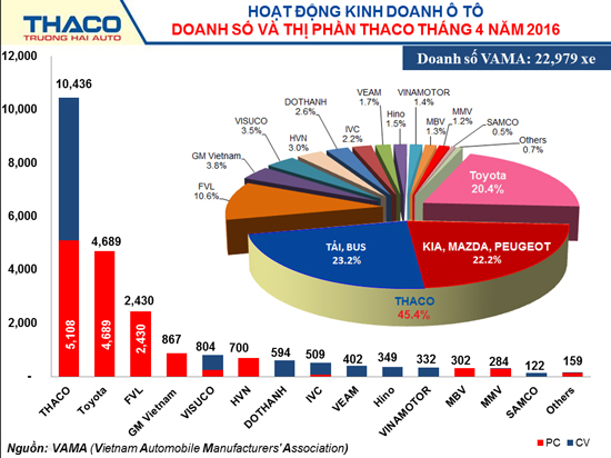 According to VAMA's report, in April 2016, VAMA sales reached 22,979 vehicles. In this figure, THACO maintained its top position in Vietnam auto market with the sales of 10,436 vehicles (5,108 passenger cars and 5,328 commercial vehicles). This is the second month in a row when THACO reached the sales of over 10,000 vehicles, accounting for 45.4 percent of VAMA market share.
