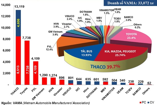 According to the report of Vietnam Automobile Manufacture Association (VAMA), over the last 2 months, VAMA members' sales figure is 11,718 cars, including 6,446 passenger cars and 4,599 commercial vehicles, in which THACO continues to lead the chart with 4,184 cars, taking up 37.5 percent of the market shares.