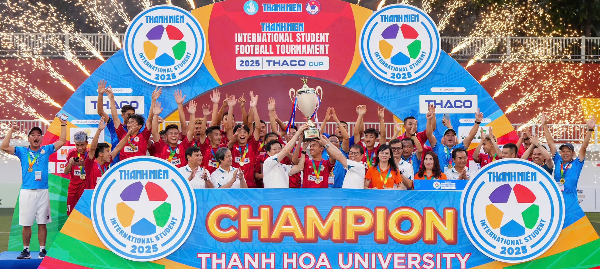 On March 30, at Ton Duc Thang University Stadium in Ho Chi Minh City, THACO Chairman Tran Ba Duong attended the final match and awarded the championship trophy to the winners of the Thanh Nien International Student Football Tournament – THACO Cup 2025.