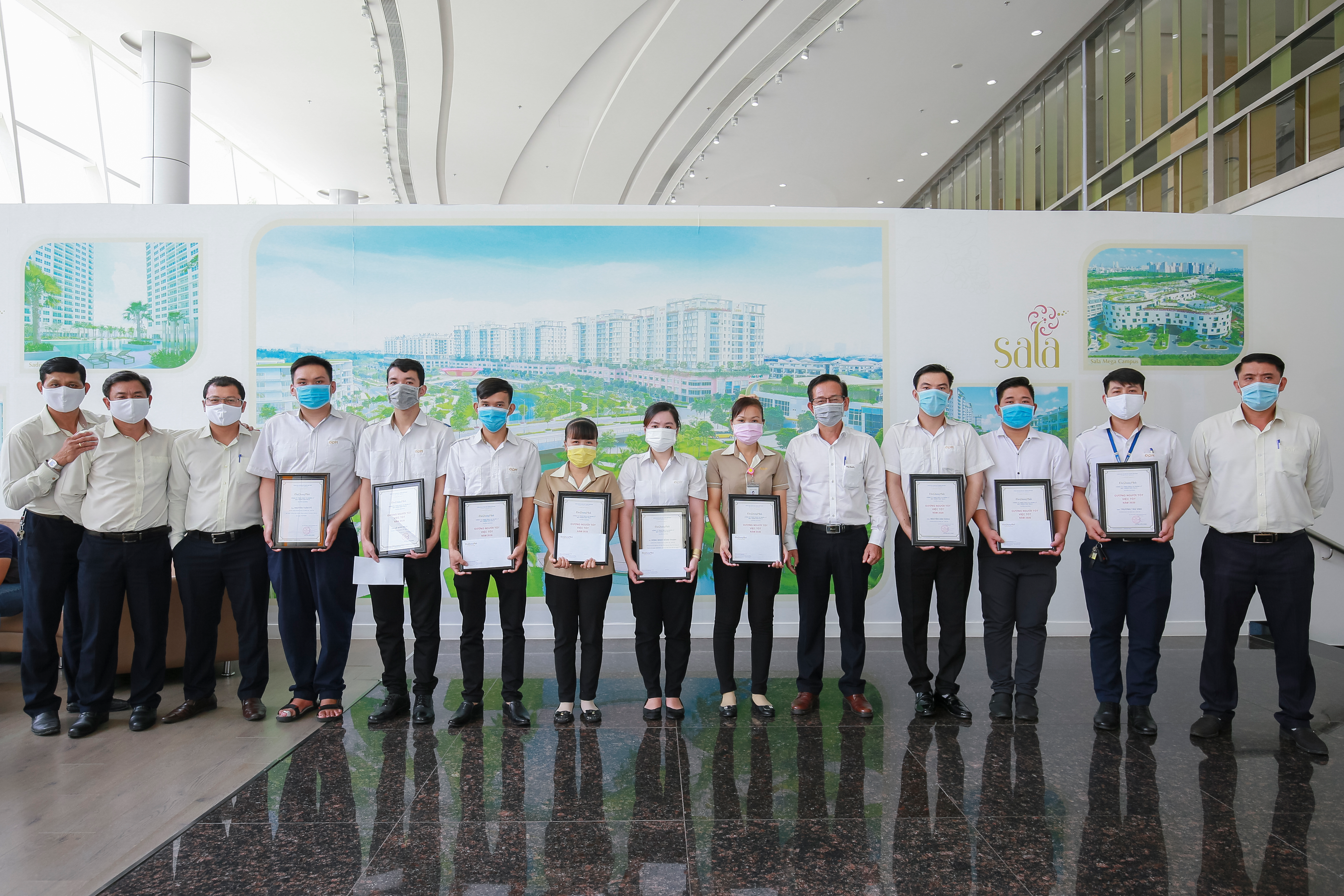 Ngày 21/8, Công ty TNHH Dịch vụ Quản lý Bất động sản Sala đã khen thưởng 9 nhân sự thể hiện xuất sắc tinh thần “Người tốt việc tốt”. Ông Huỳnh Hữu Cảnh – Giám đốc Công ty đã trao bằng khen và quà của Công ty cho 9 nhân sự được tuyên dương.