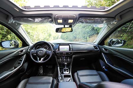 Khoang lái của Mazda6 rộng rãi, bố trí hài hòa với các chi tiết mạ crôm sang trọng, nhiều trang bị tiện nghi đẳng cấp như ghế da, vô-lăng tích hợp nhiều phím điều khiển chức năng gồm hệ thống âm thanh, thoại rảnh tay kết nối bluetooth, ghế lái chỉnh điện 8 hướng nhớ vị trí, điều hòa tự động 2 vùng lạnh, cửa gió hàng ghế sau, âm thanh Bose 11 loa (bản 2.5L), cửa sổ trời, DVD tích hợp Bluetooth, GPS, khóa cửa tự động… Đặc biệt lẫy chuyển số tích hợp trên vô-lăng (bản 2.5L) là điểm kết nối giữa Mazda 6 với những tín đồ yêu thích cảm giác lái thể thao.